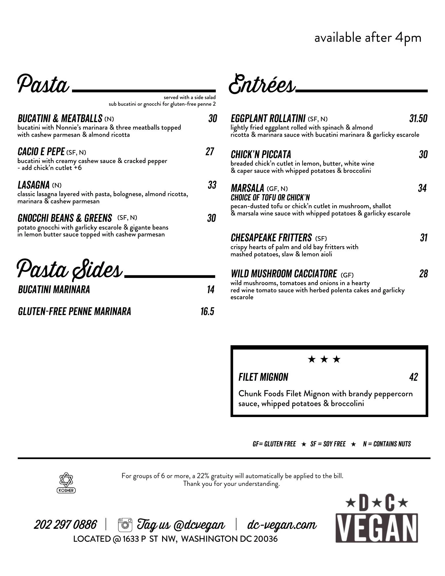 DC VeganMonday-Thursday: 11am-10pmFriday: 11am-10:30pmSaturday: 10am-10:30pmSunday: 10am-10pm Order Pickup or Delivery make a RESERVATION